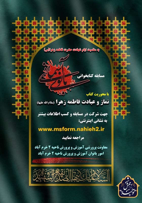 با عرض تسلیت به مناسبت ایام سراسر حزن و ماتم شهادت دخت نبی مکرم اسلام(ص)، حضرت صدیقه کبری، فاطمه زهرا(س) خدمت همه ی معلمین، دانش آموزان و اولیای محترم، معاونت پرورشی و تربیت بدنی آموزش و پرورش ناحیه 2 خرم آباد با همکاری امور بانوان این اداره، به منظور آشنایی هرچه بیشتر با سیره و روش زندگی حضرت فاطمه زهرا(سلام الله علیها) اقدام به برگزاری مسابقه ی کتابخوانی با عنوان بانوی آسمانی نموده است؛ بدین منظور از کلیه همکاران فرهنگی، دانش آموزان و اولیای محترم برای شرکت در این مسابقه دعوت به عمل می آید.